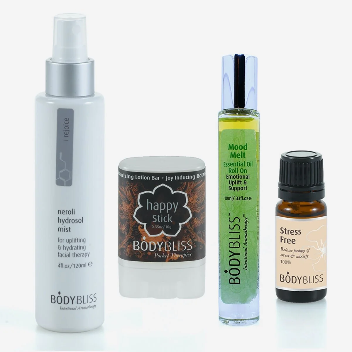 Set includes Neroli Hydrosol face mist, Mood Melt essential oil roll-on, Stress Free essential oil blend, Happy Stick lotion bar, all designed and bundled specifically to help you relax and reset.